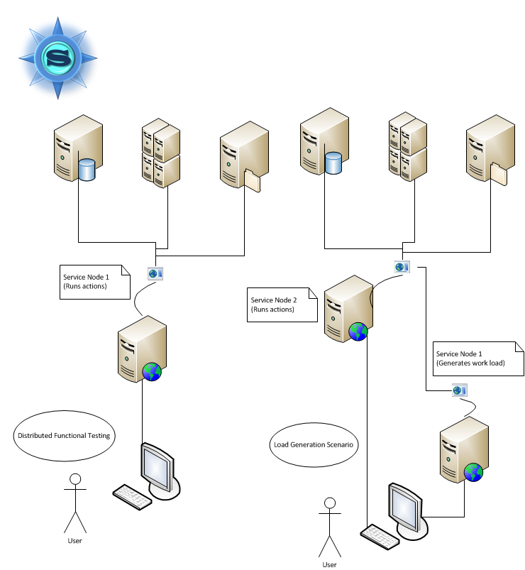 First interaction scheme is commonly used for functional tests where we operate with one server instance at the same time.second scheme is rather used for this performance tests where some of the service nodes are used for tasks generation.